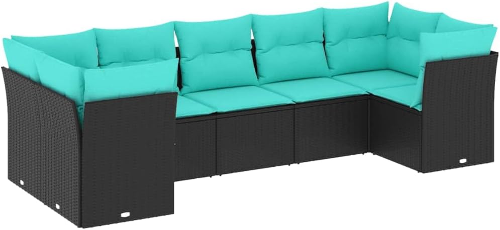 Storage function with water-proof bag: Each garden seat features storage space under the seat, complete with a water-proof bag for storing cushions, toys, and other items. The inner bags have a top cover and can be securely fastened to the seats with hook-and-loop fasteners for added stability.Sofa overall dimensions: 113.8" x 48.8" x 27.2" (W x D x H)Water-proof bag dimensions: 21.7" x 20.9" x 13.4" (L x W x H)UV-proofPlastic adjustable feetAssembly required: YesCorner seat:Color: BlackDimensions: 24.4" x 24.4" x 27.2" (W x D x H)Seat size: 21.7" x 21.7" (W x D)Seat height from the ground: 14.6"Center seat:Color: BlackDimensions: 21.7" x 24.4" x 27.2" (W x D x H)Seat size: 21.7" x 21.7" (W x D)Seat height from the ground: 14.6"Cushion:Color: BlueCover material: Fabric (100% polyester)Seat cushion filling material: FoamBack cushion filling material: Cotton fiberSeat cushion dimensions: 21.7" x 21.7" x 1.2" (W x D x T)Back cushion dimensions: 21.7" x 17.7" x 5.1" (L x W x T)Delivery contains:4 x Corner seat including storage function with a water-proof bag3 x Center seat including storage function with a water-proof bag11 x Back cushion7 x Seat cushion with removable and washable cover