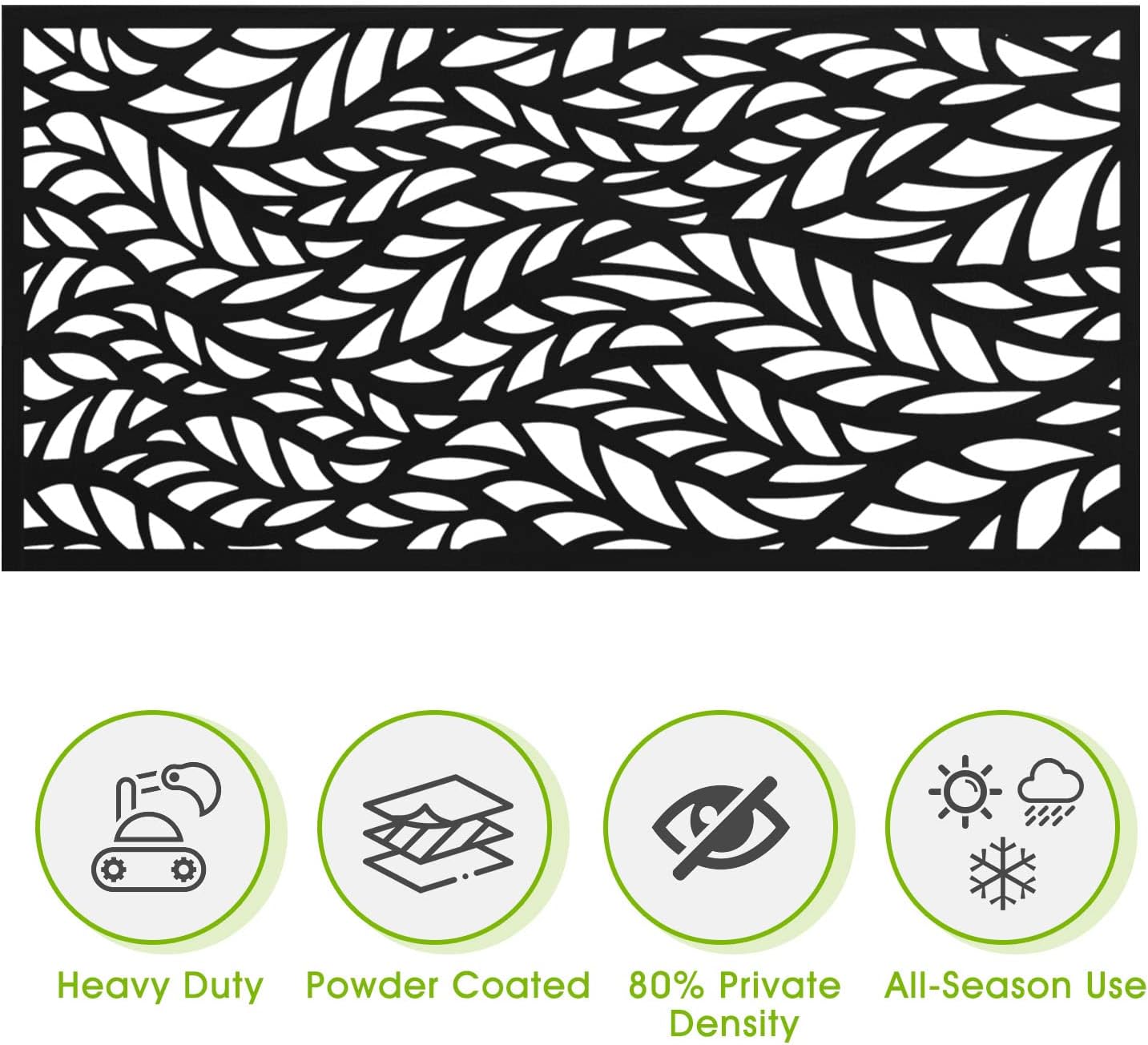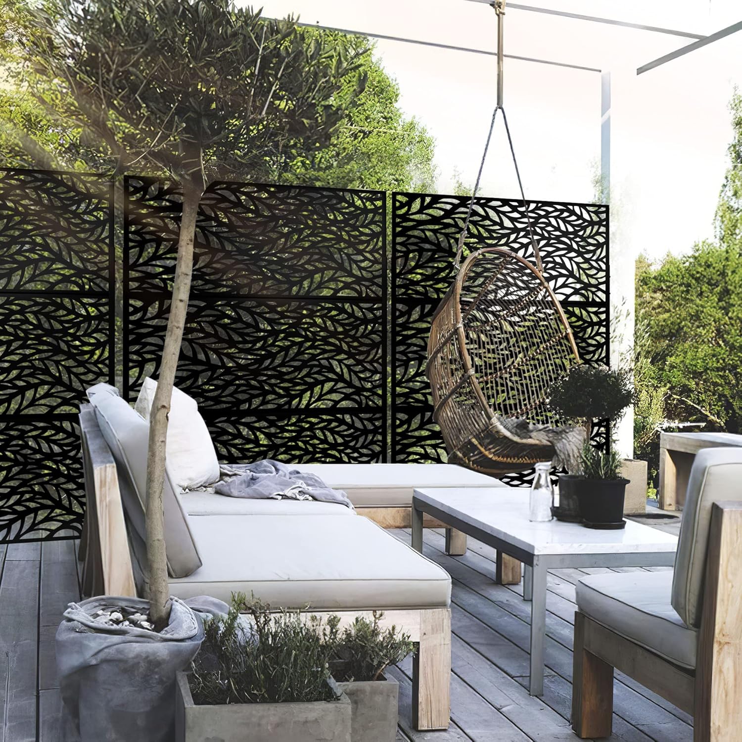 Our metal privacy screenperfect for busy homeowners, this versatile privacy panel requires no tools for setup, Use it to shield AC units, divide garden spaces, or craft a cozy coffee nook. The heavy-duty iron base ensures stability in windy conditions,adding ambiance to gatherings.