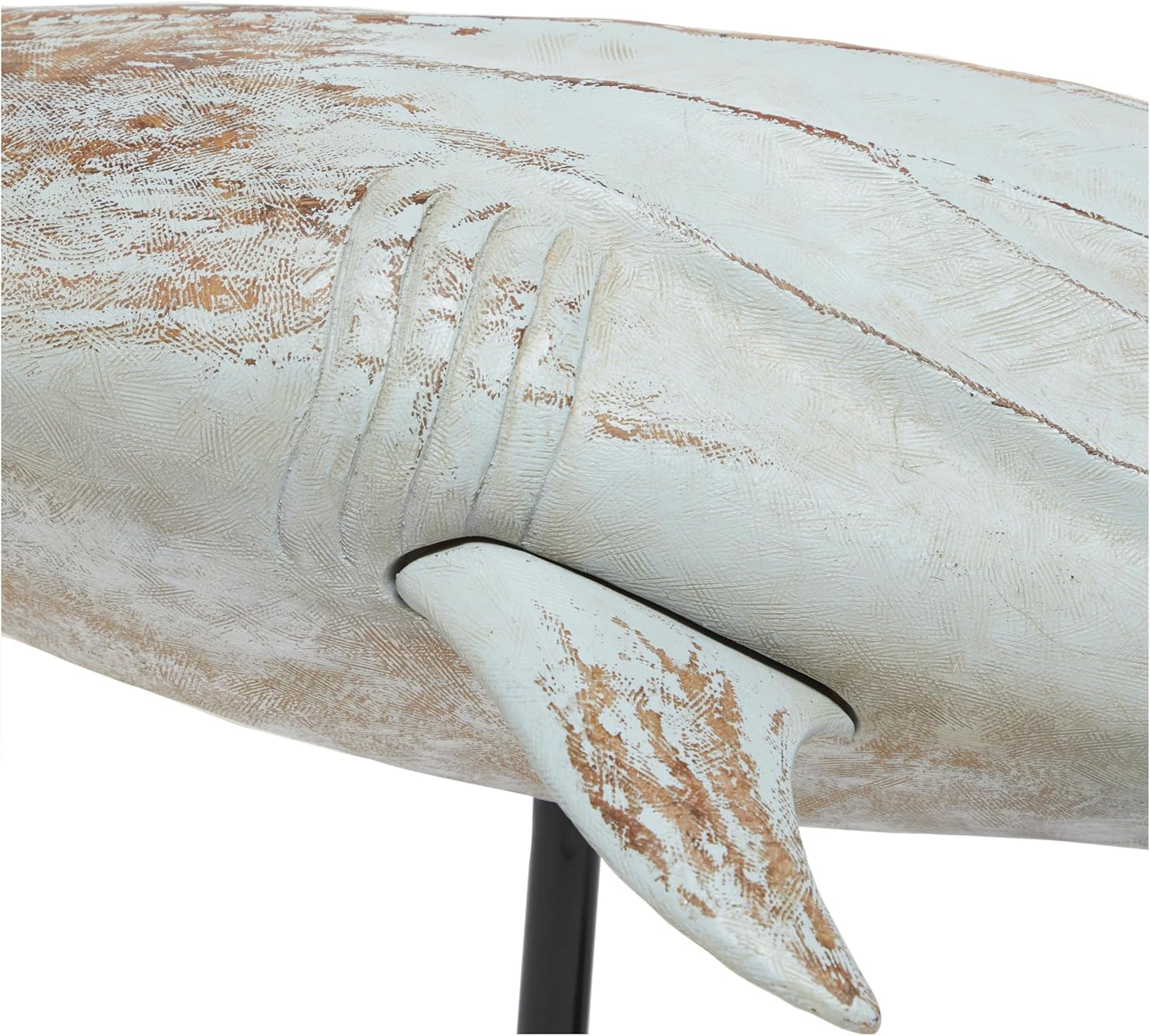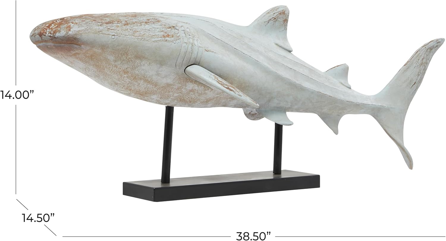 This coastal accent statue is made with the swimming shark molded with polystone and resting on one black metal pole with a base. Distressed light blue home decor figurine has a shark shape with a rectangle base that enhance its visual appeal. Wipe clean with a dry cloth. Spice up your home and get compliments from your guests by displaying this shark home decor statue on any accent table or mantel in your coastal-themed entryway, lobby, or living room. Designed with felt or rubber stoppers at the base that prevent scratching furniture and table tops, as well as sliding around. This item ships in 1 carton. Please note that this item is for decorative use only. Polystone sculpture makes a great gift for any occasion. Suitable for indoor use only. This item ships fully assembled in one piece. This is a single light blue colored statue. Coastal style.
