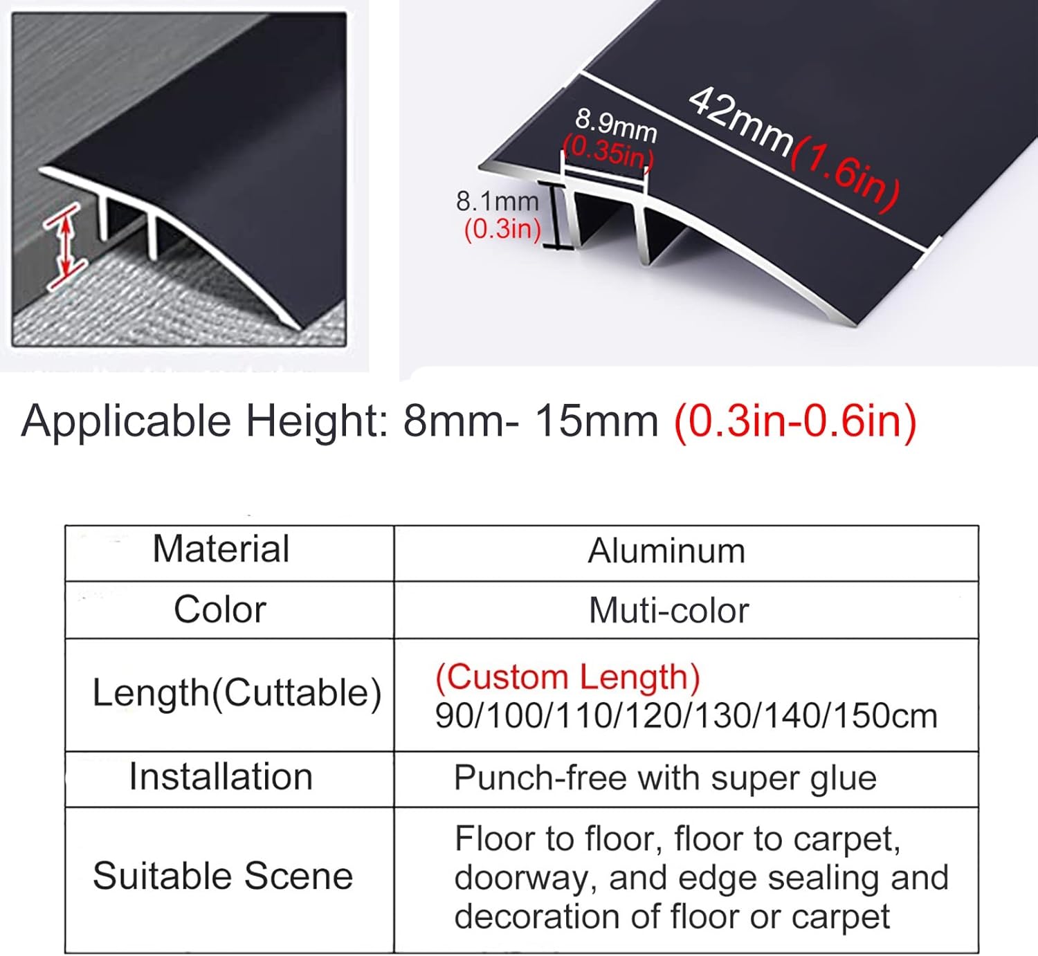 Specifications:Material: AluminumDimensions ( customizable): 90cm/35.4in,100cm/39.4in,110cm/43.3in,120cm/47.2in,130cm/51.2in,140cm/55in,150cm/59 inchesWidth: Width: 42mm (1.6 inches)Suitable height difference: 8mm -15mm (0.3 inches-0.6 inches)Weight capacity: 270 kg/600 lbsFeatures:Heavy duty aluminum withstands high foot traffic areas of the home. Supports a capacity of up to 300 kg (660 lbs).For use in doorways,room entrances or other places where two uneven floor surfaces meet.Transition rail can be easily cut at the desired length with hacksaw.Can better pass door of strollers/wheelchair or sweeping robot.There are many colors to match your home.Package includes:1 x Floor Transition StripNote:Due to manual measurement,there may be 1-3cm error.Light photography and different display may cause that the color of the objects in the photo is different from the real one.