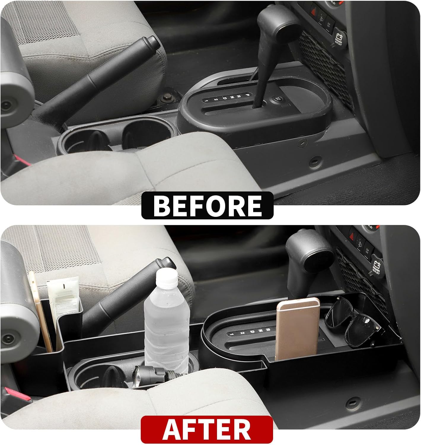 Fitment: - Compatible with Jeep Wrangler JK JKU Sports Sahara Rubicon X 2007 2008 2009 2010. Features: - OEM Fit - Extended Storage Space - Durable ABS Material - Hassle-Free Installation Sleek Appearance. Feature a sleek black finish, these storage trays add a touch of style while providing practical storage. Its aesthetic appeal enhances the look of your JK’s cabin, blending seamlessly with the factory interior. Enhanced Organization. Whether you're hitting the trails or cruising around town, staying organized is essential. These gear shift storage boxes enhance your JK's functionality and make your driving experience convenient. Keep your interior tidy and your essential items easily accessible. Solid Construction. Made from durable, high-grade ABS plastic, the JeCar center console storage organizers are built to withstand the rigors of off-road adventures and daily use. Its robust construction ensures longevity and reliability, no matter where your journeys take you. Package Included: - 3 x Gear shift storage pockets