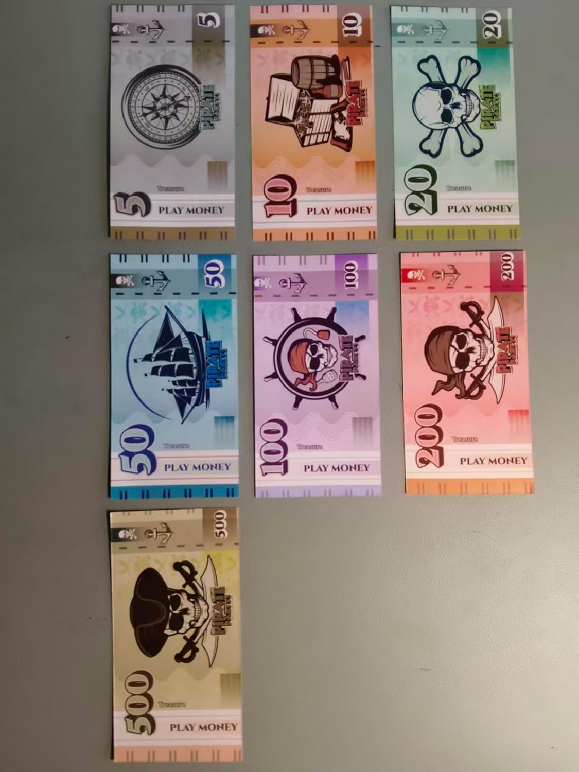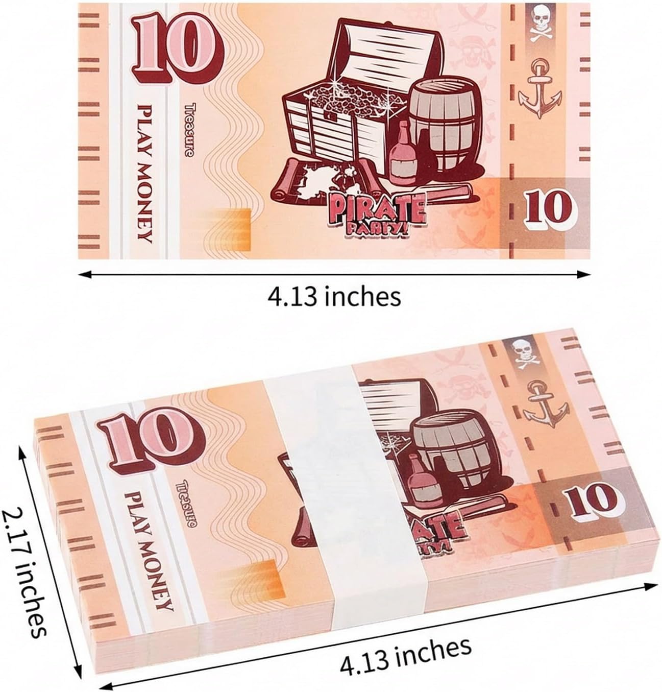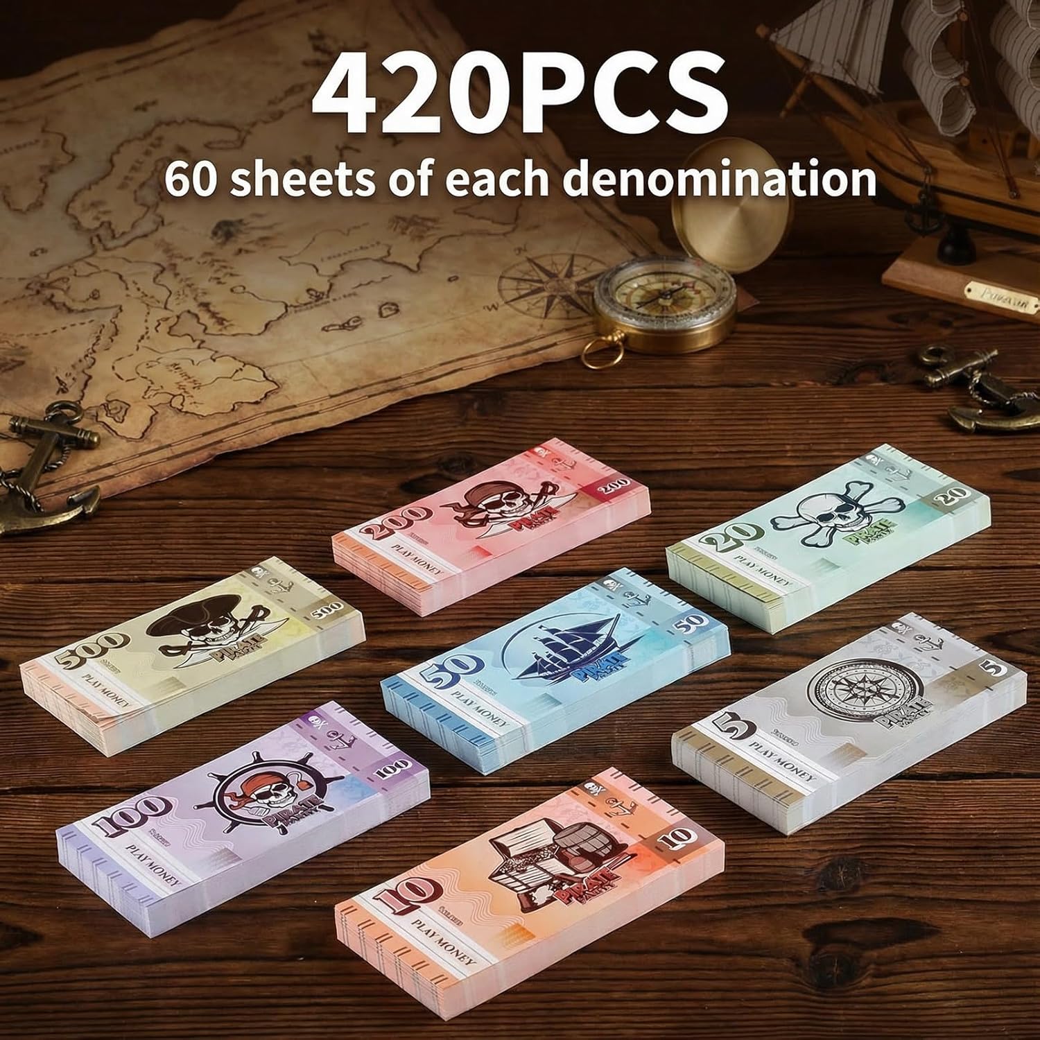 This pirate-themed play money set includes 420 pieces of game money in 7 different denominations, created for board games, tabletop RPGs, party games, and role-playing activities. The pirate-inspired designs add atmosphere and immersion, making gameplay more engaging and enjoyable. Each bill is sized at approximately 4.13 × 2.17 inches, offering a comfortable balance between visibility and easy handling on the tabletop. Designed strictly for gaming purposes, this set functions as play money and game prop money only and is not legal tender or intended to represent real currency. The variety of denominations allows for flexible gameplay mechanics such as trading, rewards, resource management, and simulated in-game economies. Whether used for pirate adventures, fantasy role-playing campaigns, custom board games, or themed parties, this play money set provides a practical and visually appealing solution for enhancing interactive game experiences.