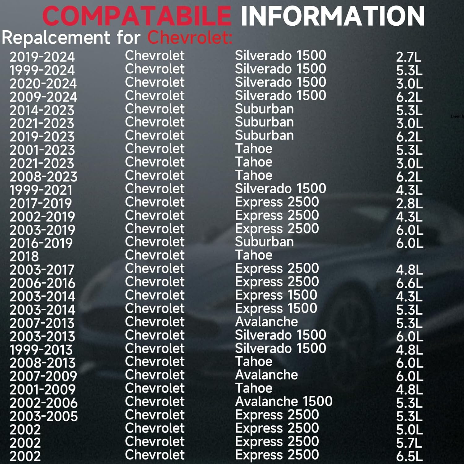 1999-2024 Chevrolet Silverado 1500, 2014-2023 Chevrolet Suburban, 2001-2023 Chevrolet Tahoe, 2000-2023 GMC Yukon, 2015-2023 GMC Yukon XL, 1999-2022 GMC Sierra 1500, 2002-2019 Chevrolet Express 2500, 2018 Chevrolet Tahoe --, 2003-2014 Chevrolet Express 1500, 2003-2014 GMC Savana 1500, 2007-2013 Chevrolet Avalanche, 2002-2006 Chevrolet Avalanche 1500