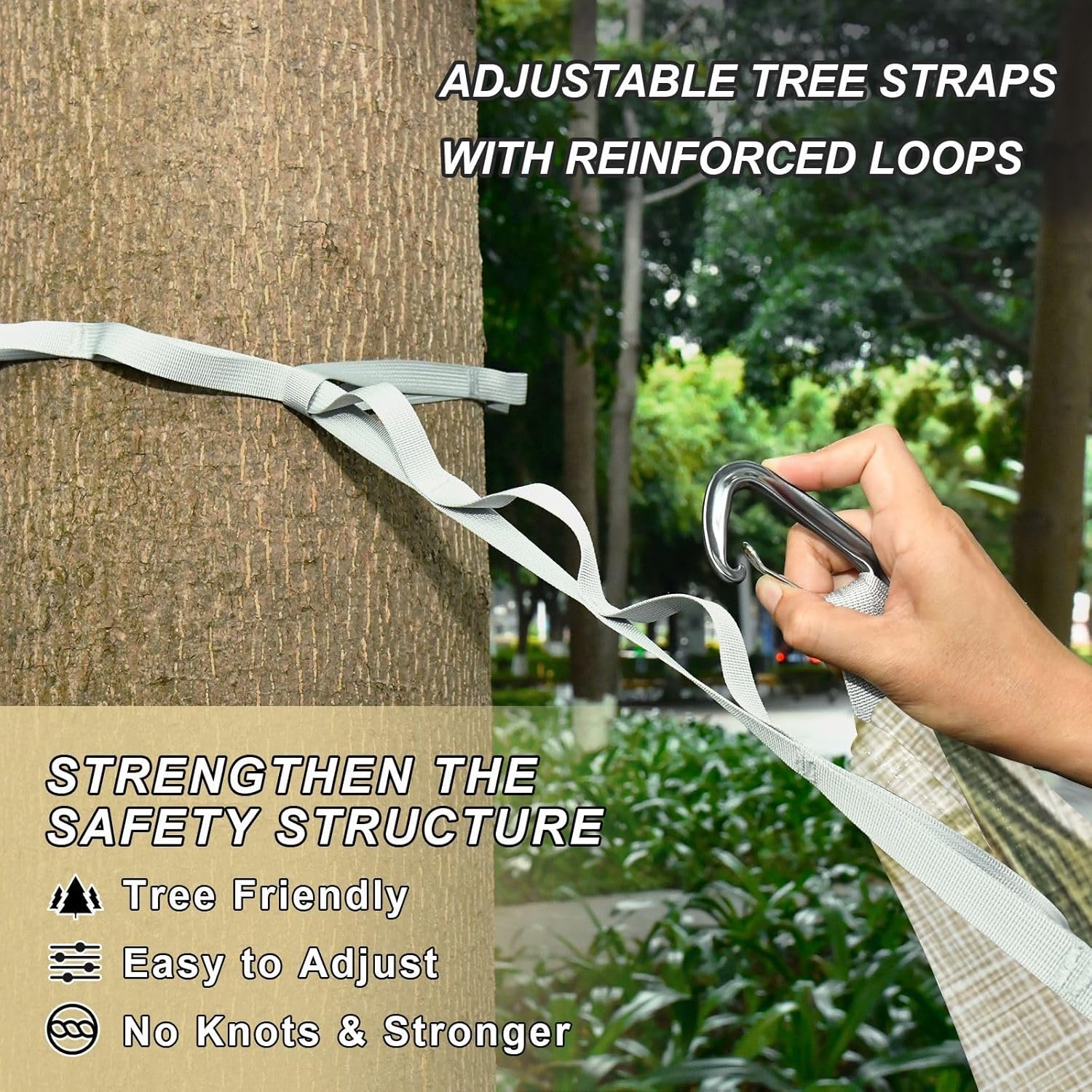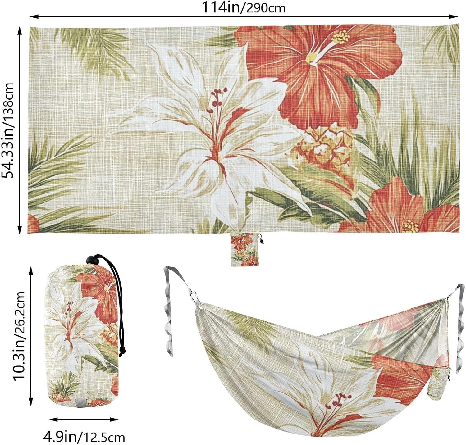 Large Size Width: 114in/290cm ×54.33in/138cm. Although Backyard Hammock is used as a hammock, the space is large enough to accommodatwo peoplo rest together. It can bear a load of 330LB/150KG.Material Description: Polyester. Rope Hammock fabric is made of high-strength and breathable 210T polyester taffeta, which has excellent wear resistance, tear resistance and breathability, ensuring comfort and safety. The climbing buckle is made of aluminum alloy, and three belt is made of high-density 600D imitation nylon webbing, which is sturdy with strong load-bearing capacity.Thoughtful Design: There is a small pocket on the edge of the hammock, which is convenient for you to store your mobile phone and other small items when you rest.Lightweight and Multi-purpose Hammock: Whether you are going camping, hiking or relaxing in the garden, this Hanging Hammock can meet your needs. Moreover, this is a necessity for going camping and having fun.Washing Instructions: Machine washable (Please removhe climbing buckles before machine washing, and storhe webbing in a separate laundry bag before putting it in the washing machine). Do not use detergents such as bleach.