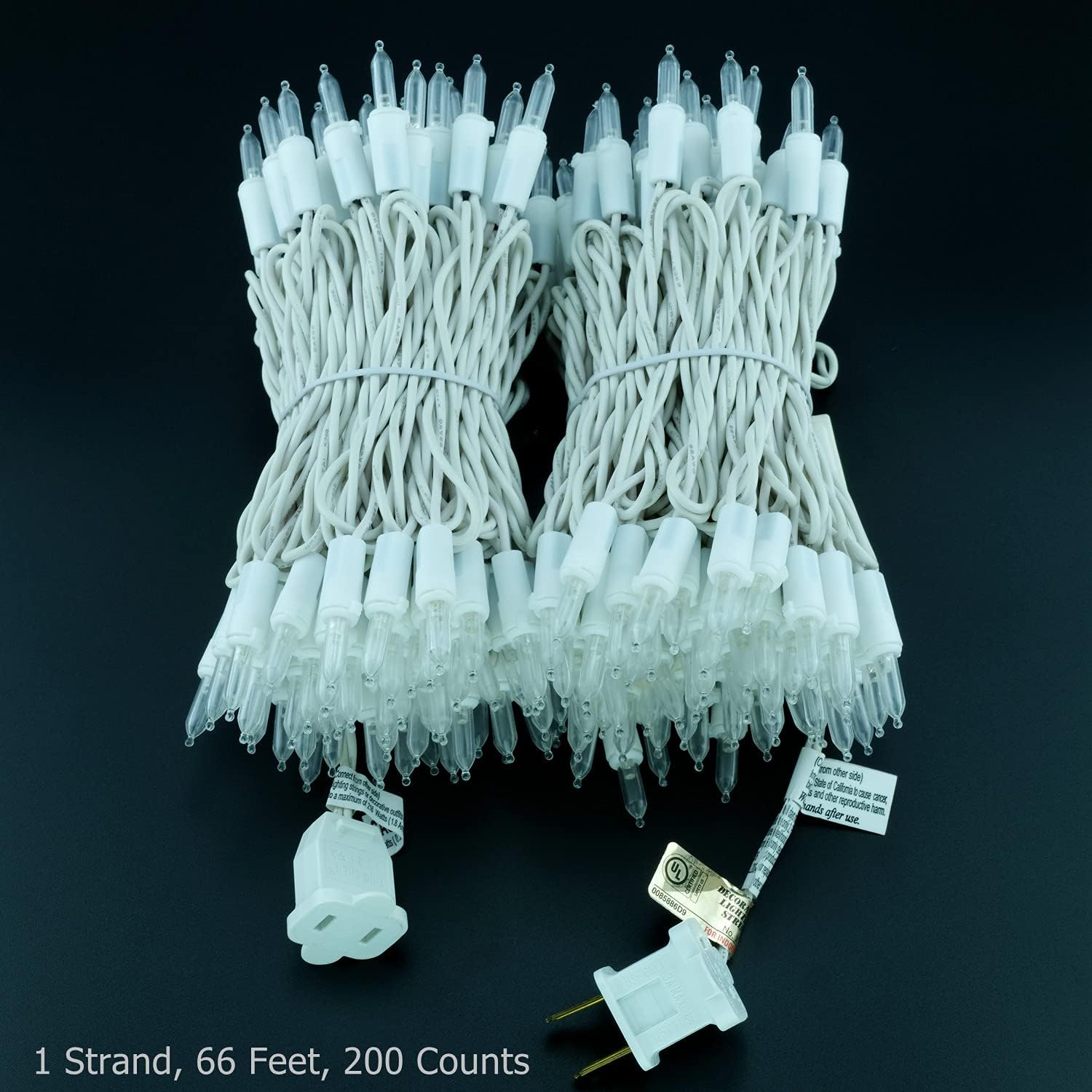 YULETIME 200 Count Cool White LED Christmas Lights, 66 Feet White Wire UL Certified Commercial Grade Holiday String Light Set (Cool White)♥ SPECIFICATIONS LED Light Color: Cool White Light Display: Steady Bulb Type: LED Bulb Shape: Mini Bulb Material: Acrylic Removable Bulbs: Yes Average Hours: 50,000 Feature: One goes out the rest stay lit Voltage: 120 V Wire Color: White Wire Gauge: 22 AWG Male Plug: Fused/Stackable Female Plug: End-to-End Rating: UL Certified Grade: Premium Fire Resistance Rating: Class A 105℃ Ingress Protection Rating: IP44 Usage: Indoor / Outdoor Dimensions: - Total Length: 66 ft - Lead: 4 in - Spacing: 4 in - Tail: 4 in Actual Power: - 7 Watts - 30 Max sets connected♥ WHAT'S IN THE BOX: 1 x 200 LED Cool White String Lights 2 x Extra Fuse 4 x Extra LED Bulbs 1 x User Manual ♥ Warm Tips.1. One package contains 1 strand of uninterrupted 200 lights, NOT multiple strands. 2. Male and female plugs must not be wet or immersed in water. 3. End-to-end connections with more than 30 strands running simultaneously, or input voltage above 120 volts will blow the fuse. 4. Fuse is located in male plug and 2 replacement fuses included in each strand. 5. Additional fuses may be purchased locally at auto parts and hardware stores.